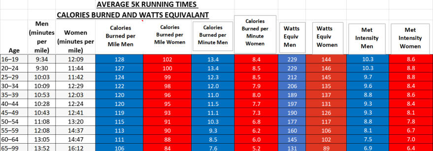 Average 5k Run Times to Calories Burned & Watts Equivalent Converter